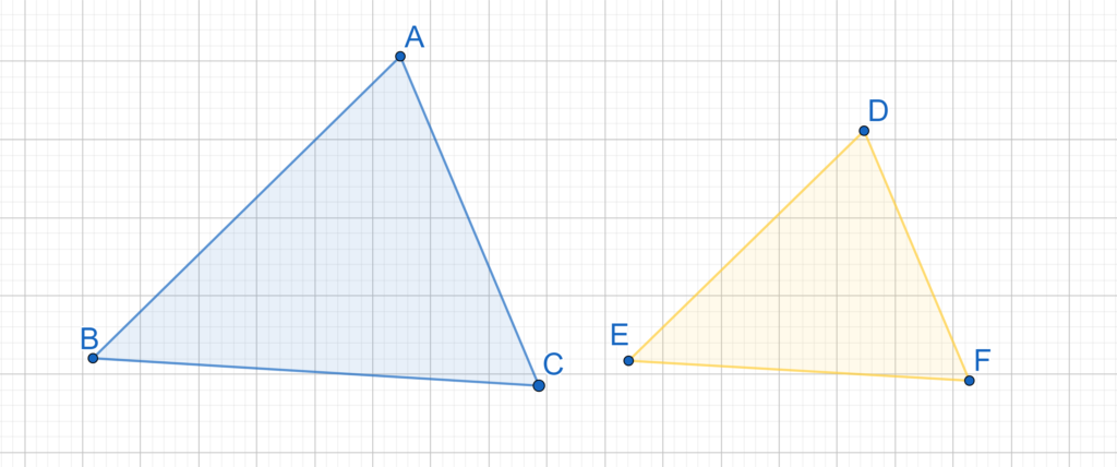 $$ \large \text{Si} \ \angle ABC = \angle DEF, \ \angle BCA = \angle EFD, \ \angle CAB = \angle FED, \ $$ $$ \large \text{entonces los triángulos ABC y DEF son semejantes.} $$